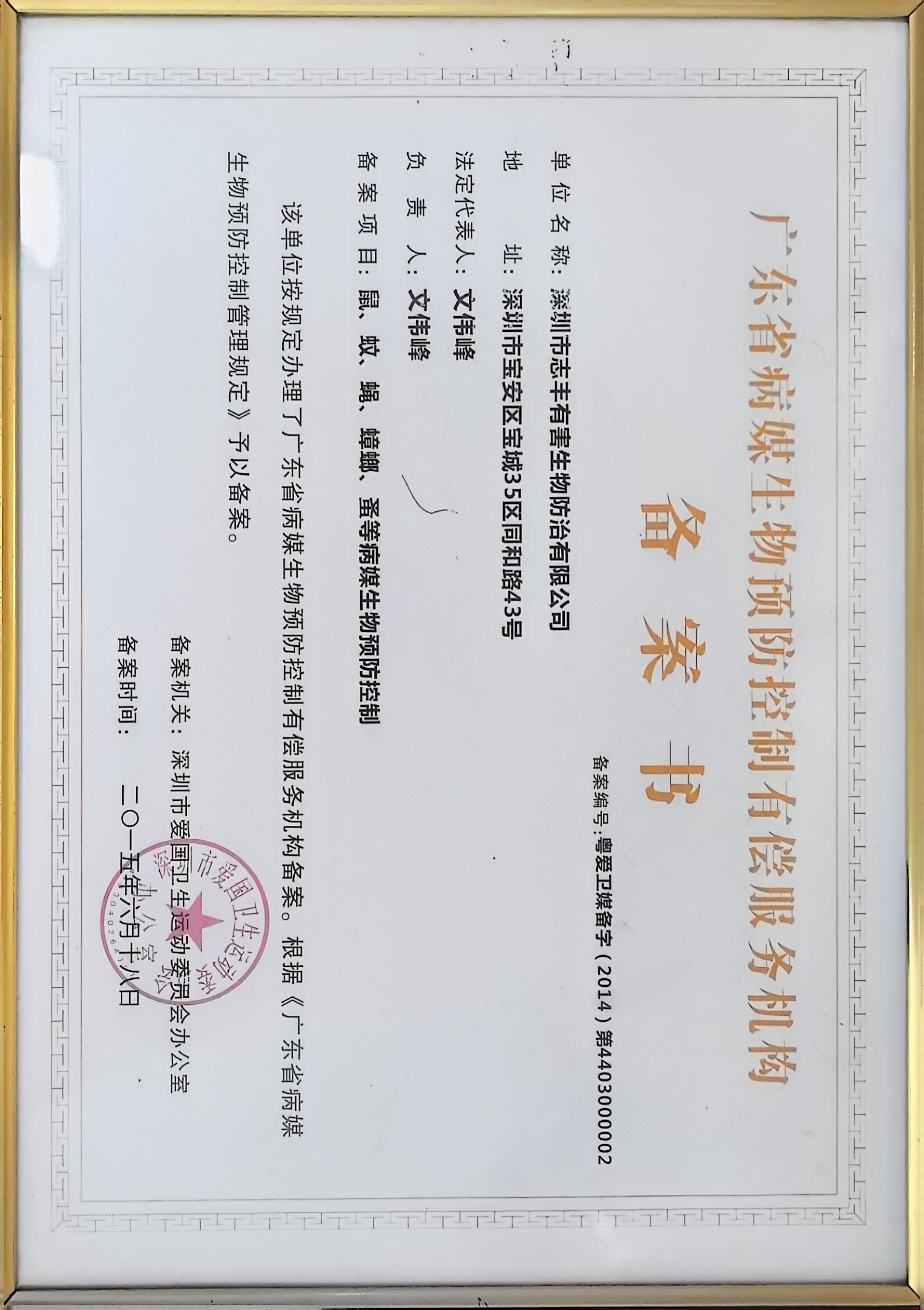 10年專注病媒生物防治,擁有“深圳市病媒生物防治服務機構服務能力A級證書”,驗收標準嚴于國家標準,連續3年深圳市有害生物防治協會授予“先進企業”。